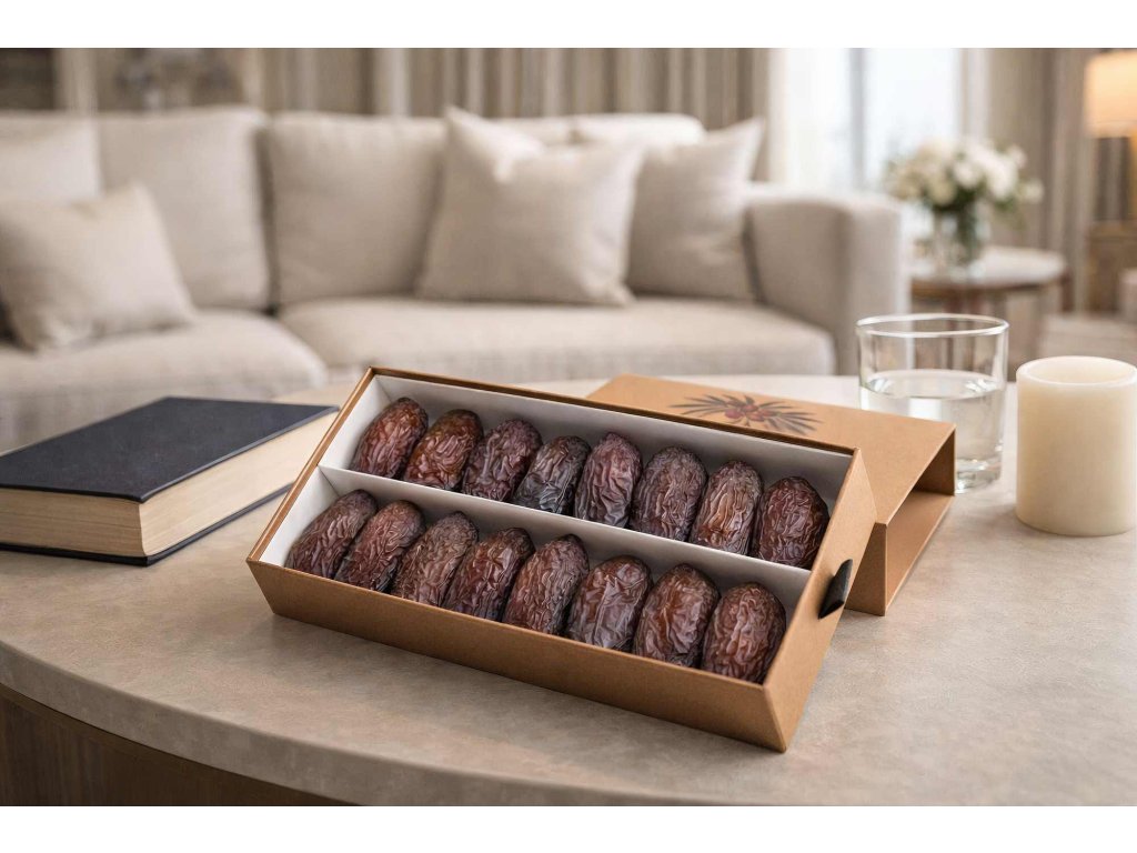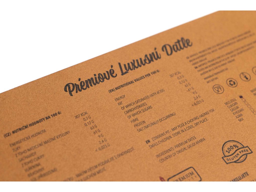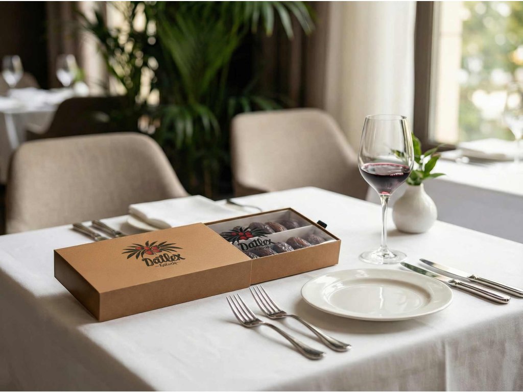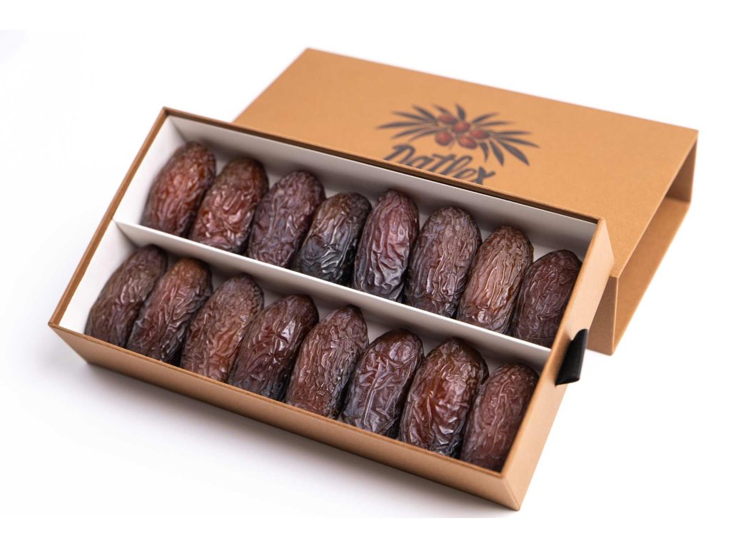 • Elegantní servírování: Dárková krabice je navržena tak, aby datle mohly být servírovány přímo v ní. Vypadá reprezentativně na slavnostním stole a zároveň chrání přirozenou šťavnatost plodů.