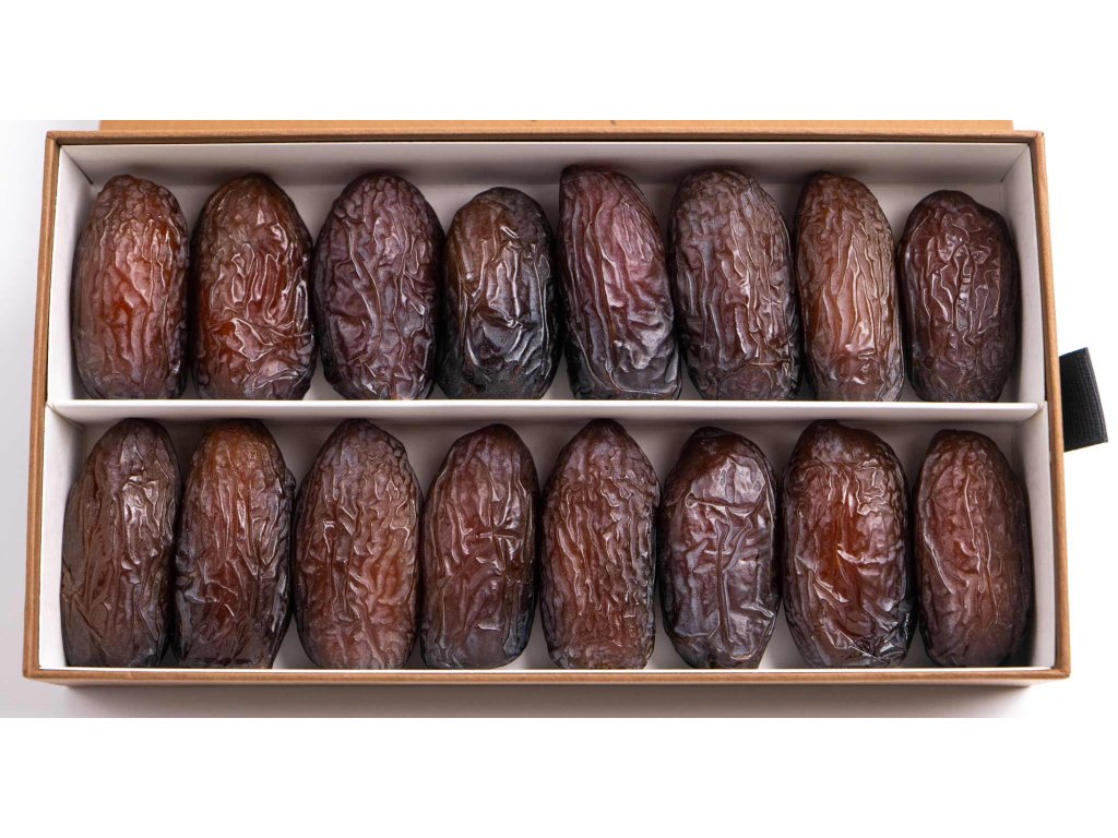 • Extra Jumbo kategorie pro dárkovou edici: Do exkluzivní krabice se dostávají pouze ručně vybrané plody v rozmezí 24-30 gramů. Každá datle je pečlivě kontrolována, aby splňovala nejvyšší standardy velikosti a kvality. Tato váhová kategorie zaručuje maximální šťavnatost, plnost a intenzivní karamelovou chuť.